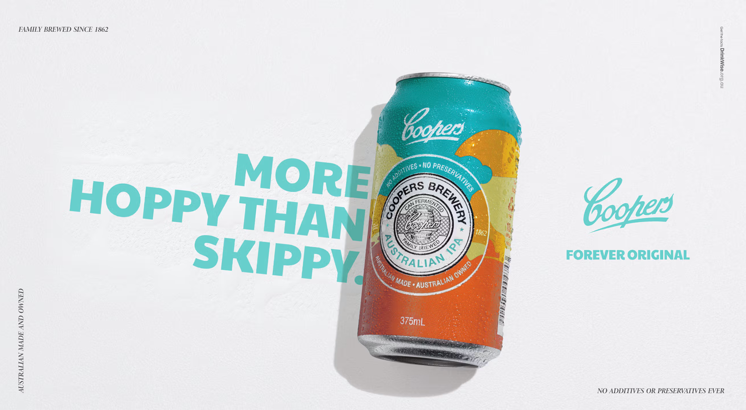 Coopers is a truly iconic Australian brand. Having stuck to its original recipe, unique brewing processes, and remaining fiercely independent since 1862, it is the nation’s original craft beer. Coopers was slipping in brand awareness, relevance and consumption with the under-40s so the brand needed a tune-up. We developed a new positioning for the brand – ‘Forever Original’ – grounded on the fierce independence, confidence, and authenticity of the Coopers family and the beer they’ve brewed for six generations. We also developed a distinctive identity for the brand, using the motif of rolling a Coopers to unlock its flavour. Across a suite of assets, Coopers cans rolled out the brand’s statement.